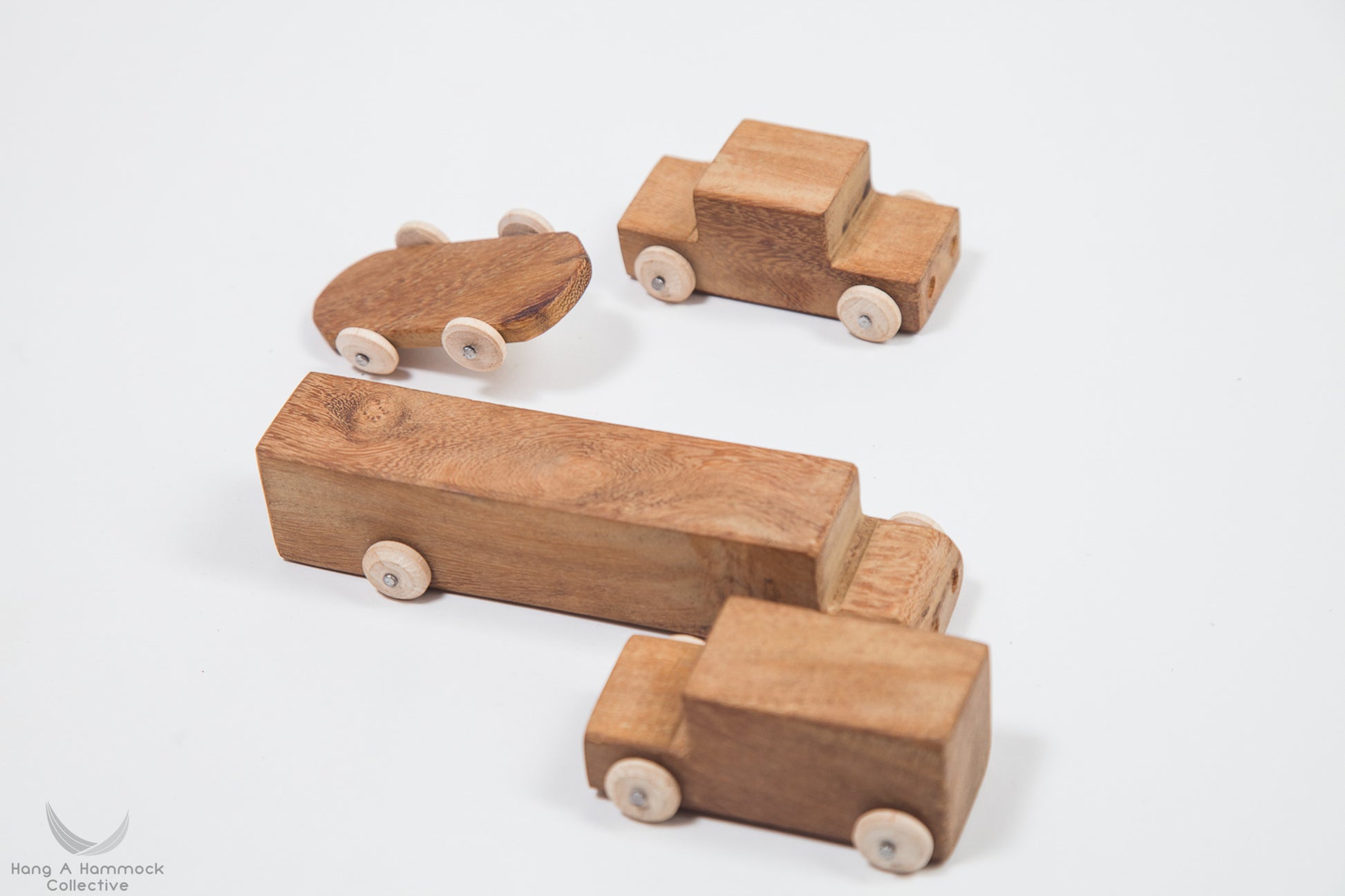 The 4 different types of wooden vehicles can teach your children that on the roads there are different forms to move around, not only private cars.